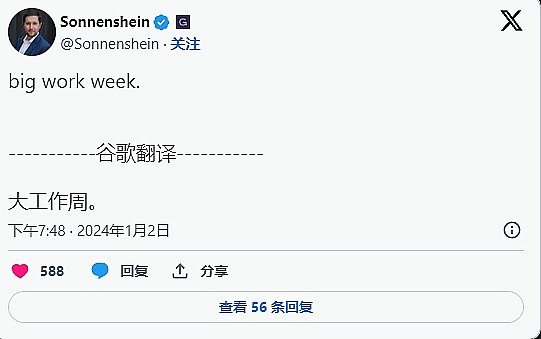 Grayscale 首席执行官 Michael Sonnenshein 同时也在 X(前身为 Twitter)上表示“本周工作量很大”。他似乎在指出加密市场即将迎来重要的一周,因为 SEC 准备宣布批准现货比特币 ETF。一些报告表明 SEC 最早可能会在 1 月 6 日联系比特币 ETF 发行人。
