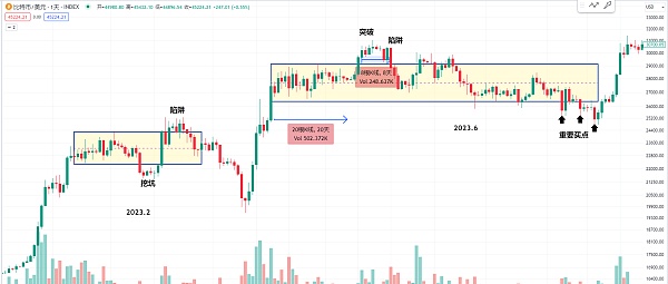而且我们可以再观察比特币在2023年2月份这个位置的走势 就是一波上涨之后 按照以往的经验 就是比特币的主力经常会制造陷阱 就比如这个箱体的区间 下方挖坑 然后突破 突破上去之后上方又挖了陷阱 真正做多的点位我们就尽量观察他有没有可能跌破箱体的位置 或者去寻找前面的一些支撑区