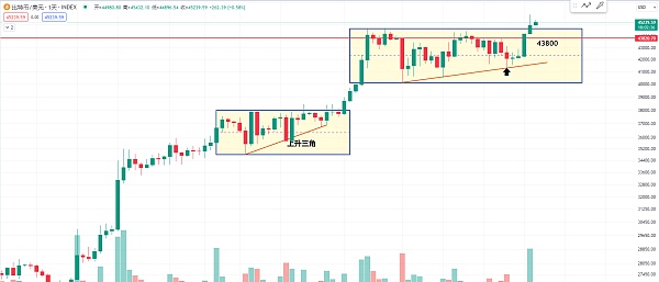 所以现在我们再观察一下比特币目前的这个位置 突破今天是第一天 后面还有7天我们就要观察 7天如果能够稳住这个上方 或者是继续突破46000 那我的观点有可能这个位置就是有效的突破