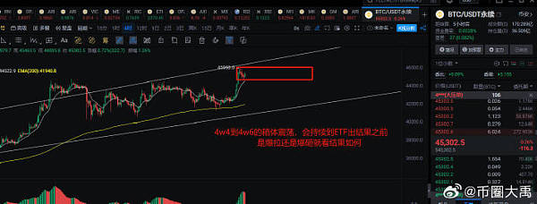 2024.1.32023年,大A经历了许多波动与变化。由于宏观经济环境的复杂和多变,大A仍然呈现出整体震荡的走势。美联储将进入降息周期,全球流动性由紧转松,北向资金流出的抽水效应将减弱甚至逆转;可能出台更多利好政策。赔率就是盈亏比,大A向上的弹性要大于向下的弹性。上证综指3000点处于长期支撑线上,下跌空间相对有限。当前股债性价比处于历史高位,表明现在进场的性价比更高。技术面日线:目标48000不变,今早这笔合约拉到45487,预计在这个位置还要盘整一段,再向上冲刺四小时线:这笔要开始44000-46000的箱体震荡了,等待ETF结果公布,可以高抛低吸15分钟线:昨日最低插到44600,给到了回调上车的机会,但是是半夜,也没多少人上车吧操作计划:均价为41800的多单继续持有