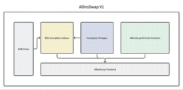Allins 旨在为各种区块链上,为铭文资产在 AMM DEX 上创建无缝交换体验,该协议主要包含铭文索引器、转换器、创新的链上合约以及 Allins 前端几个主要组件。