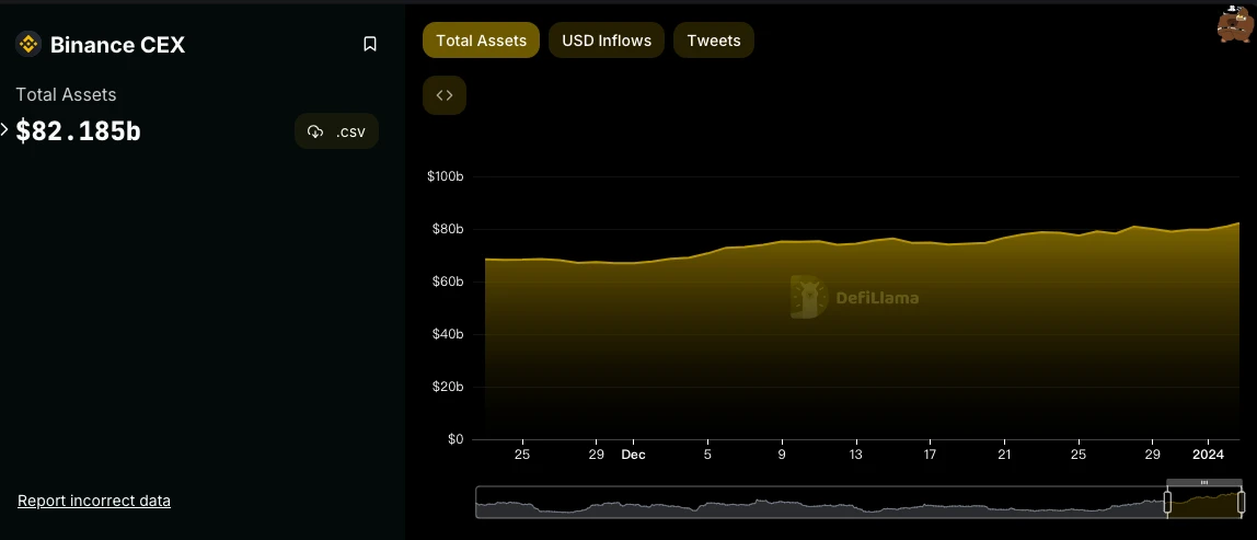 在这样的共识基础下,币安的业务基础非但没有遭遇创伤,反而是博得了市场更强的信任。DeFillama 数据显示,自 11 月 22 日起,币安在资金动向方向呈现出了稳定的正流入,截至发文资金储备已达 820.18 美元,较和解之日增长了近 20% 。