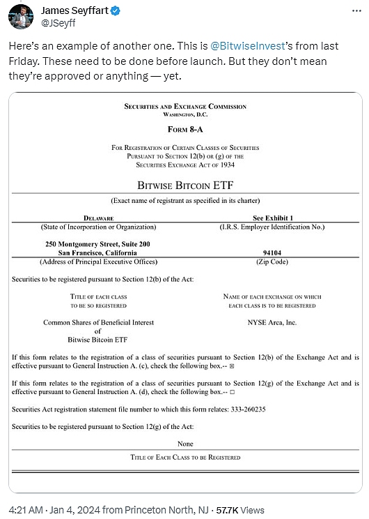 他指出,Bitwise于2023年12月29日向NYSE Arca提交比特币现货ETF注册申请,但分析师表示,这两项申请“并不意味着它们已获得批准或任何其他信息。Volatility Shares Trust于6月在CBOE BZX交易所推出杠杆比特币期货ETF股票上市之前,向美国证监会提交了8-A表格。