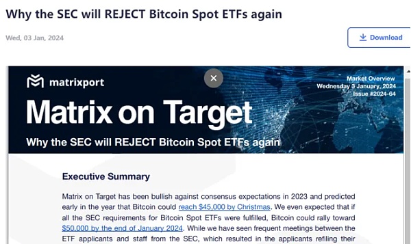 比特币现货 ETF 被拒的担忧出现,Matrixport 报告成导火索