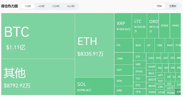 据 Coinglass 数据显示,在快速下跌的短短 1 小时内加密货币市场全网合约爆仓近 5 亿美元,比特币爆仓超 1 亿美元。