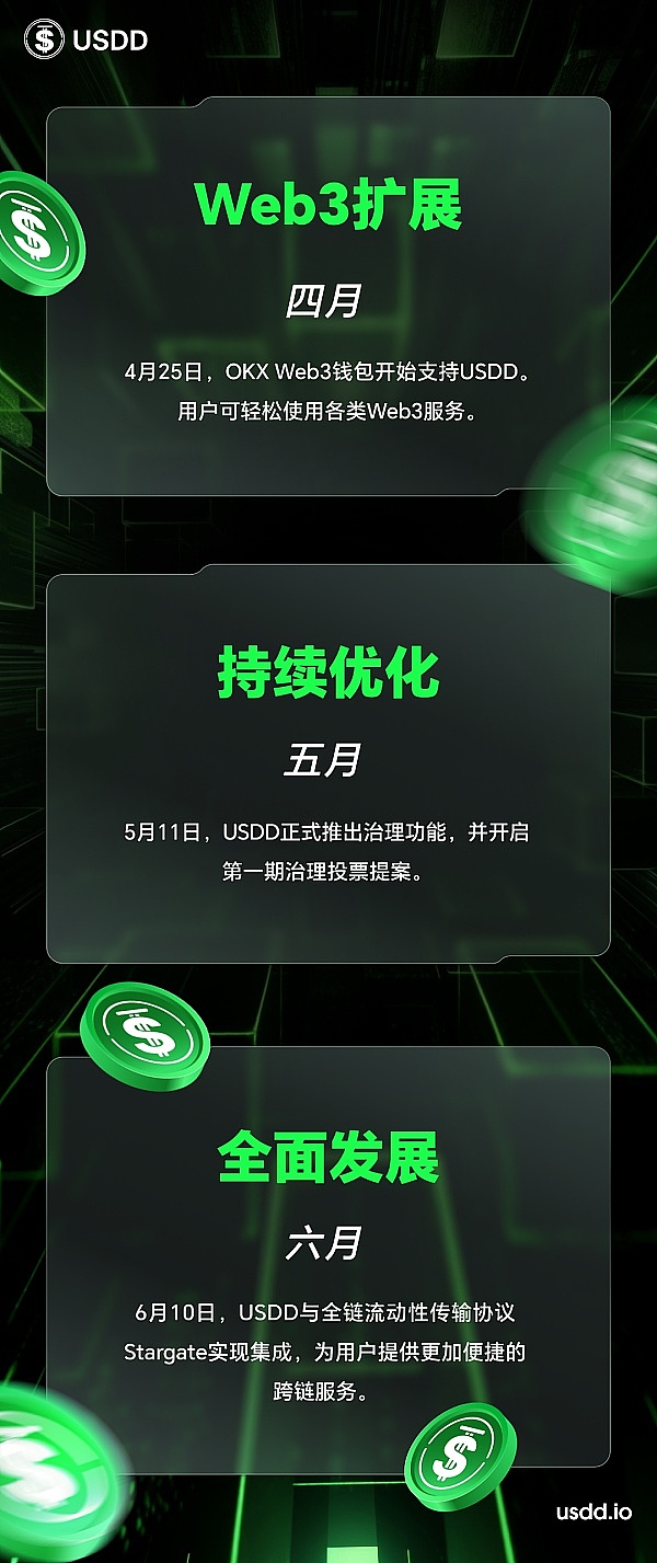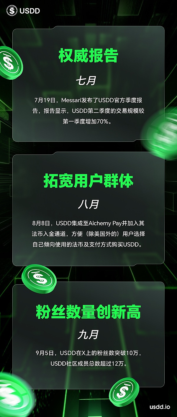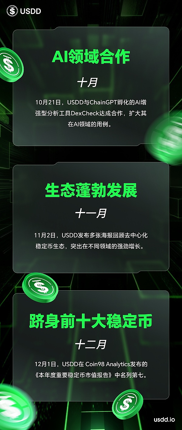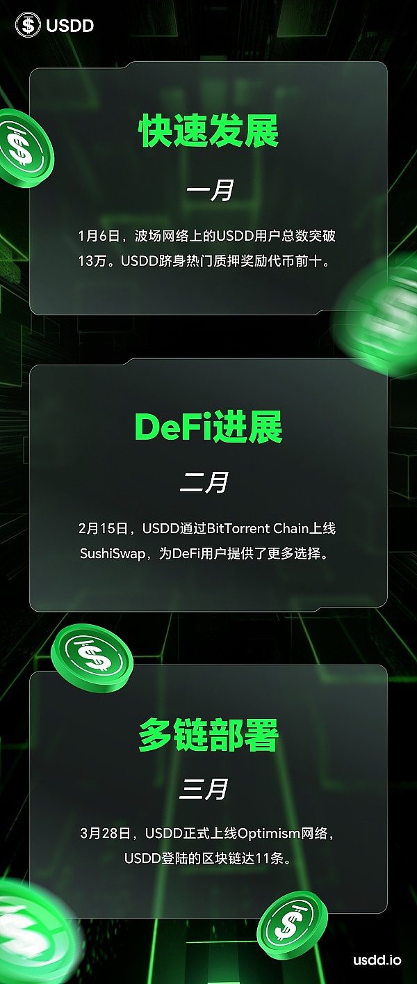 回首2023年,去中心化超抵押稳定币USDD经历诸多重大进展和突破,在波场TRON网络稳定币生态中发挥了重要作用。展望2024年,USDD还将继续乘风破浪,实现更多的应用场景,惠及更多全球用户。