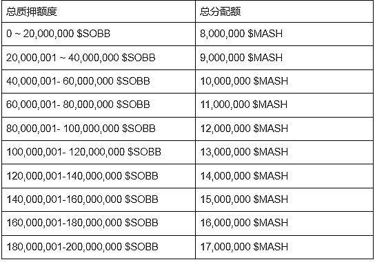 对于质押轮次,所分配的 $mash 额度视质押 $SOBB 质押池质押 $SOBB 规模而定,而用户获得的 $mash 的额度,将按其质押占比分配。据了解当$SOBB的总质押量达到180,000,001时,触发分配额度上限(17,000,000 $mash),但仍支持继续质押$SOBB。当质押结束时,质押池总量未触发分配上限,则剩余分配额度自动进入公开随机池(Lucky Draw)。