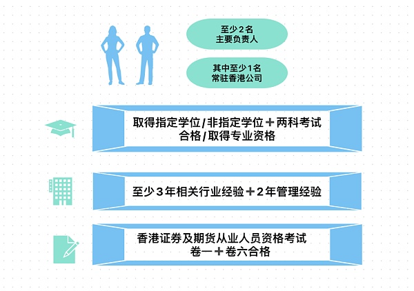 ①行业资格:持有指定的大学学位,如会计、工商管理、经济、财务、法律等),或者持有其他大学学位,且至少2科指定科目考试合格,或者取得专业资格,如特许财务分析师、认可财务策划师等。