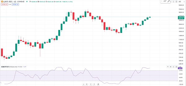 包括我们可以看一下2015年比特币的底部 威廉指标也是在80的下方 但是最近有一个问题 我们可以看一下目前的区间也是在这个超买的区间 所以我们观察一下比特币在历史上比如说2019年的这个位置 威廉指标来到了20左右 或者是目前的威廉指标也是在非常过热的区间