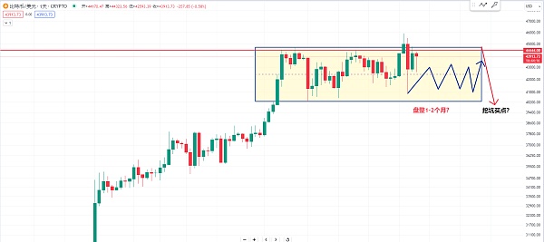 然后我们再来看一下比特币日线的箱体 也是说了有一段时间了 目前我的观点是我们还是观察一下前面这几个高点的位置 这个44.4K附近 或者是昨天来到了这个位置又有点压力上不去
