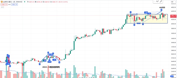 所以我的观点是不排除这一两周之内比特币的现货ETF有可能会在美国证券交易所上市 但是我的观点还是一样 我们尽量观察空间 主力是非常的鸡贼 之前我也是有说过 空间高点的位置我们尽量观察 有利好不一定就是利好 而且就这几天他这个46000附近看跌蝴蝶的D点