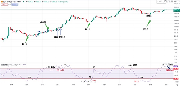 所以我们观察一下下方比特币在2021年的这个位置 也是在相对比较超买的区间 或者是他后面进入熊市 但是他这个位置我的观点是目前比特币马上要进入减半的时间 有可能这个位置在过热的情况下我们就要提防 比如历史上在2015年的几个位置 当时在这个位置也是马上要减半 然后有一次大跌