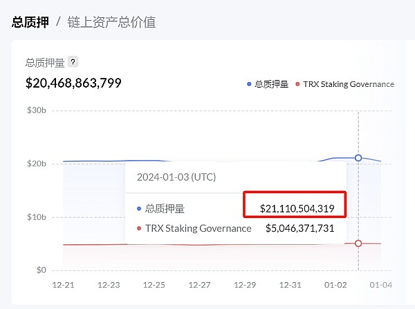 区块链浏览器TRONSCAN数据显示,2024年1月3日,波场TRON总质押量(TVL)达到21,110,504,319美元,超过211亿美元,创历史新高。