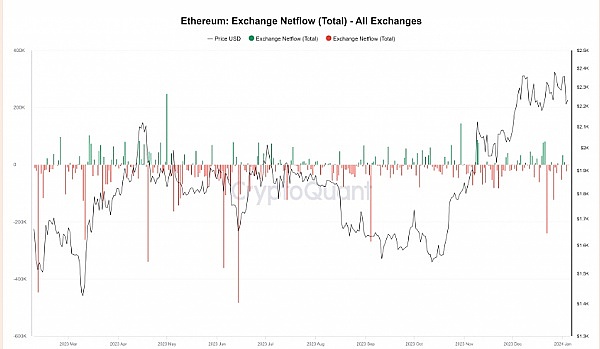 然而,这种模式在 1 月 3 日发生了转变,超过 22,000 枚 ETH 离开了交易所。交易所的净流量仍然为正,尽管幅度不大,表明销量有所增加。