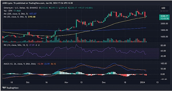 1 月 2 日,以太坊显着下跌超过 6%,根据每日时间框架图表,收于 2,210 美元左右。图表分析显示今年开局良好,但截至 1 月 2 日出现一些间歇性下降。