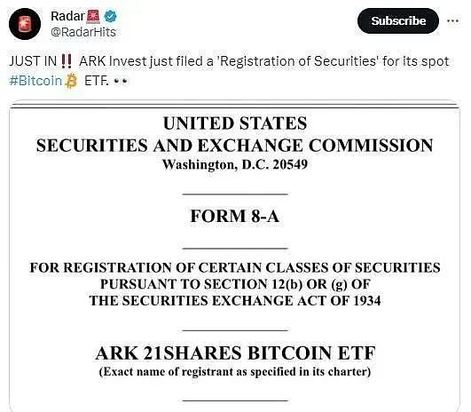 根据公开文件,方舟基金(ARK Invest)与21 Shares的合资企业已向美国证监会提交了比特币现货ETF的证券注册申请,即8-A表格。值得注意的是,8-A表格仅是证券注册的一部分,需要在ETF启动前完成,它并不代表ETF已经获得正式批准。