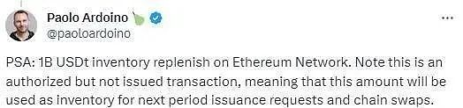 2023年12月25日,Tether发布公告称,在以太坊网络上进行了一笔10亿美元的USDT库存补充。当时,Tether的首席技术官Paolo Ardoino强调:“请注意,这是一笔经过授权但尚未发行的交易,这意味着这笔资金将用作下一期发行请求和链上交易的库存。”