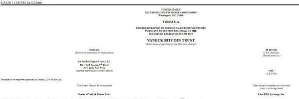 VanEck已向美国证监会递交了比特币现货ETF的证券注册申请,使用的是8-A12B表格,即全国证券交易所证券上市登记表。这一表格根据1934年证券交易法第12(b)条的规定提交,是上市过程中的必要文件。值得注意的是,该表格的递交并不意味着ETF已经正式获得批准。