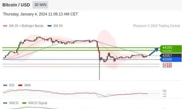 根据CMTrade的观点,“42500美元是我们的枢轴点,我们更倾向于看到价格反弹至44250美元。”
