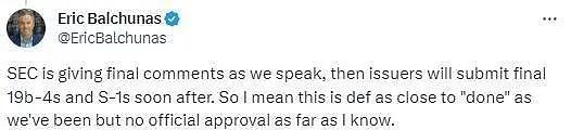 彭博ETF分析师Eric Balchunas在推特上表示,美国证监会正在就比特币现货ETF提供最终意见,发行人将很快提交最终的19b-4和S-1文件。尽管比特币现货ETF的获批工作已经接近完成,但据他所知,尚未正式获得官方批准。