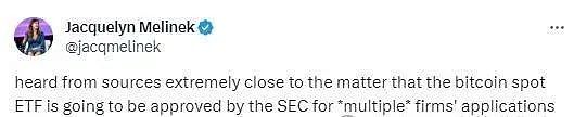 TechCrunch记者Jacquelyn Melinek在推特上发布消息称,根据知情人士透露,美国证监会将批准“多家”公司的比特币现货ETF申请,预计将在周五晚些时候发布通知。