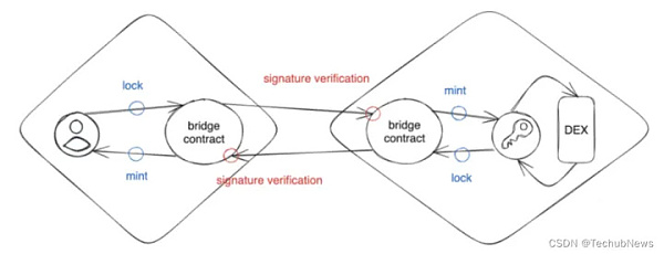 备注:图中以 lock-mint 为例说明,事实上资产传递还有 burn-unlock 和 burn-mint 两种情况