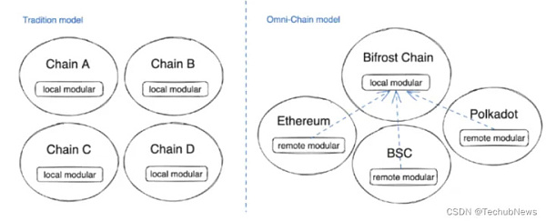 在这种结构下,应用程序并不需要在所有链上重复部署实例,而是仅在一条链上部署核心模块(总店)的同时,在其他链上部署一个轻量化的远程模块(分店)。任何其他链的用户都通过跨链的方式远程访问应用程序,获取服务。