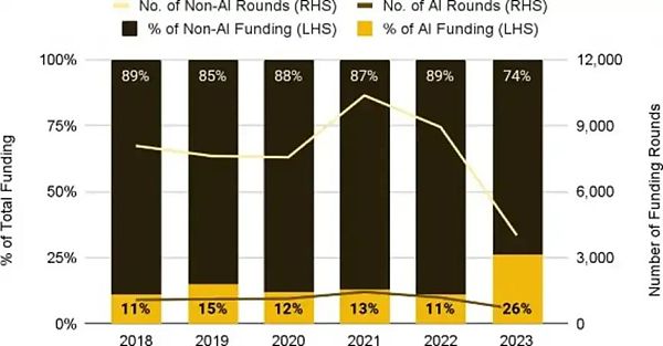 与 2022 年相比,非人工智能领域的绝对资金减少了 65%,而人工智能领域的资金减少幅度相对较小,仅为 6%。