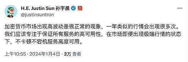 1月4日,波场TRON创始人孙宇晨在社交媒体表示:“加密货币市场出现高波动是很正常的现象,一年类似的行情会出现很多次。我们应该专注于保证所有服务的高可用性,在市场即便出现极端行情的状态下,不卡顿不宕机服务高度可用。”