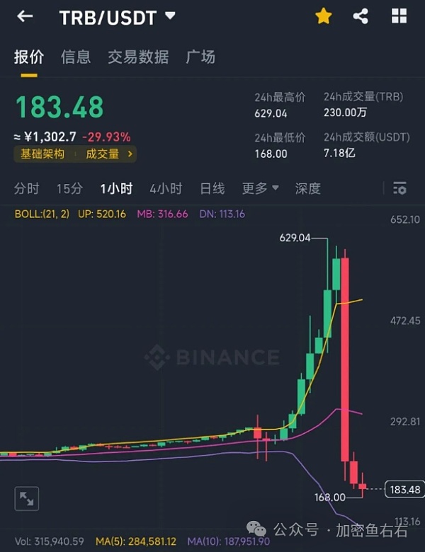 Trb从7的低点涨到73,然后翻倍到140左右,在所有的怀疑和做空中,一路涨到629,然后在2024年1月1日元旦那天,当所有人都在庆祝和哀悼又一年的时候,当所有人都在睡觉的时候,然后在早上6点,一个大瀑布连天。干到168,一路落在后面,多少人就这样冲破了仓库。