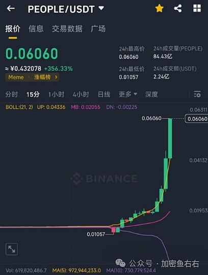 people,1月3号打响接力赛第一枪,从0.01只用了几个小时拉到最高0.07,翻了7倍,一下引爆币圈,一鸣惊人天下知!最好的营销手段莫过于此。 People是上一轮的明星币种,有部分人在底部埋伏,那么这一波也就赚到了,不过所有人都没办法卖在最高点,正确的方法是边拉边卖。