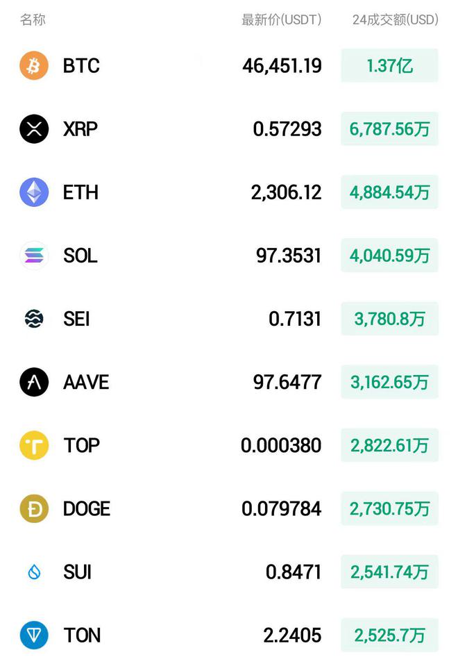 比特币(BTC)过去24h涨幅为6.47%,最高报47200美元,最低报43195美元,波动率8.16%。以太坊(ETH)走势相对略弱,上涨4.53%,最高报2357美元,最低报2166美元,波动率8.28%。