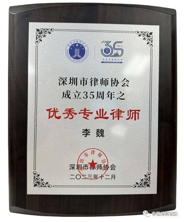 其中,“深圳市律师协会成立35周年之优秀专业律师”的评选条件要求获奖人具有丰富的法律专业知识和较高的执业水平,在其业务领域成绩显著,服务质量和工作业绩受到客户、行业内部和社会各界的认可。李魏律师凭借专业的业务能力和严谨的服务态度,成为深圳市律师协会成立35周年评选的21名优秀专业律师之一。