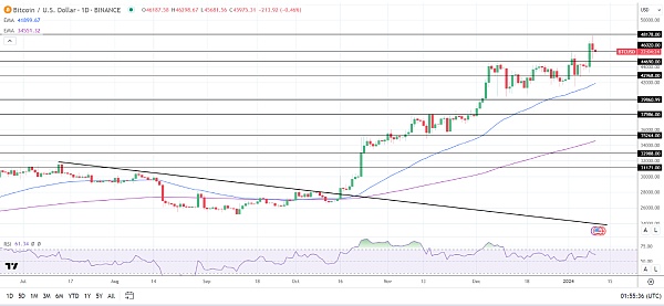 14日RSI读数为61.34,表明比特币在进入超买区域之前突破48178美元的阻力位。