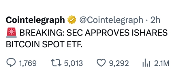 2023年10月16日,据CoinTelegraph报道称,美国证监会已批准贝莱德的iShares比特币现货ETF。在短短20分钟内,当时爆仓了1亿美元。但很快市场发现不对劲,因为彭博社等主流媒体并没有报告任何内容。
