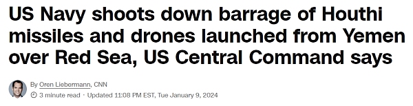 美国CNBC报道称,这也是胡塞武装自包括美国在内的13个国家发表联合声明,并承诺追究武装分子在红海袭击商船责任以来的首次大规模袭击。