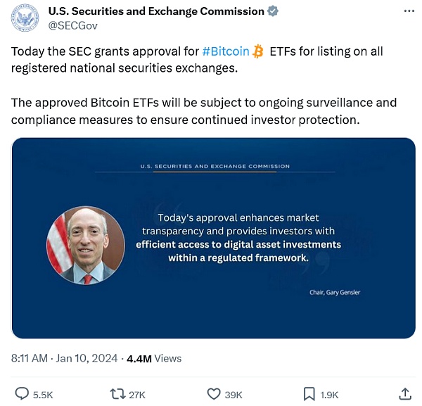 时间快转到本周,美国再次发生假新闻事件。美国证监会官方推特账户突然传出重磅消息称,监管机构批准了所有13个比特币现货ETF,但事实上并未获得批准。