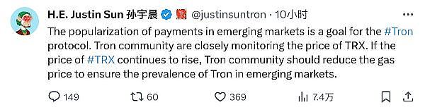 1月10日,波场TRON创始人孙宇晨在社交媒体表示:“在新兴市场普及支付是TRON协议的目标。波场TRON社区正密切关注TRX的价格。如果TRX的价格继续上涨,波场TRON社区应该降低gas价格,以确保波场TRON在新兴市场的普及。”