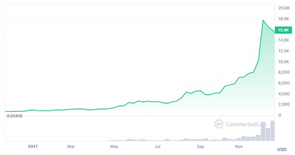 2017 年,加密货币迎来了牛市,比特币的价格从年初的最低不到 900 美元上涨到年末的 1.8 万 美元,涨幅超过20 倍。