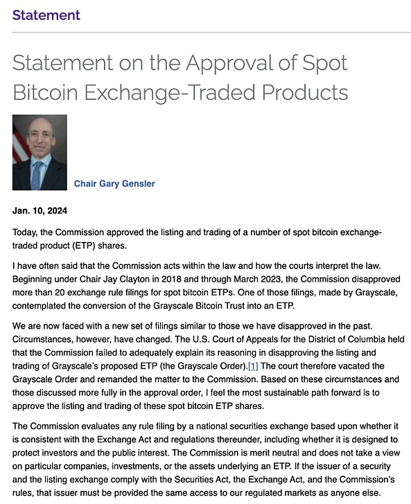 看得出来,Gary Gensler 依然是一副不情愿的样子,但无论如何最终还是通过了,这在加密货币的发展历史上,是一件具有标志性意义的重大事件!