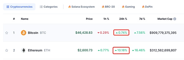 在 SEC 宣布批准现货比特币 ETF 后,比特币先是下跌,然后被快速拉升到将近 4.8万美元,目前基本上是在 4.6万美元左右波动,而 ETH 的价格则是直接暴涨,突破了 2600美元。