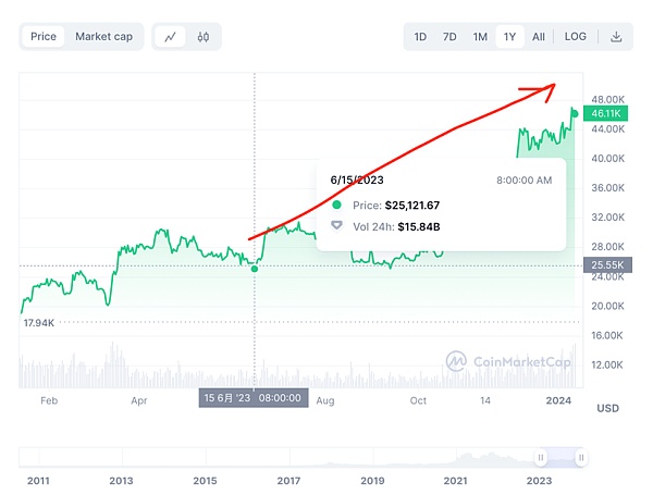 资管巨头贝莱德在去年6月份开始申请现货比特币 ETF,经过了7个月的时间终被 SEC 批准通过,BTC 价格也从去年6月份的 25000 美元上涨到如今的 46000美元,涨幅达到了 84%。