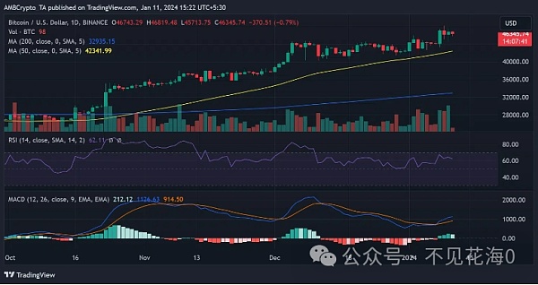 此外,BTC 的每日时间框架分析显示,尽管价格超过 46,000 美元,但仍有小幅下滑。截至撰写本文时,其交易价格约为 46,300 美元,小幅下跌不到 1%。