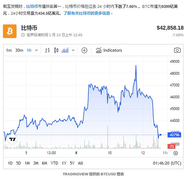 1月12日,比特币(BTC)价格大幅下跌,比特币ETF在美国市场交易前两天后进入周末。