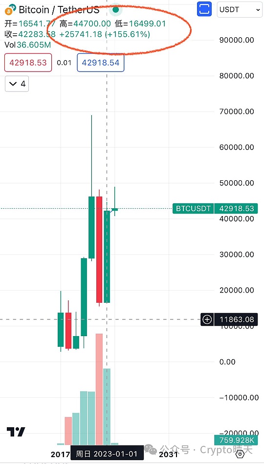 根据以上分析,我们可以做个不那么科学的推测。如下图,2023年BTC价格从16541到42283(开盘和收盘价),涨幅255%。如果4和3一样或略高于3,那么2024年假设涨幅在255%+,价格将达到107800左右或以上。2025年收小阳线收尾,本轮周期结束。
