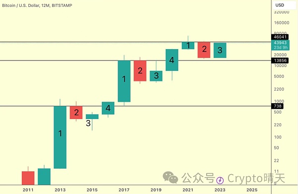 上图一看似简单,其实内含的信息量很大。该图是BTC的年线,红色是熊市,绿色是牛市,遵循1红加3绿每4年一轮大周期趋势。红色柱后面必然是绿色柱。离我们最近的红色是2022年,过去的2023年就是3,以此类推。