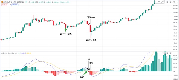 或者我们再找一下历史的经验 比如说在2020年当时疫情崩盘的点位 我们可以观察一下 像在这个位置他一天是下跌了40% 如果下方的macd指标死叉 那么从第一根红柱开始我们就可以期待了