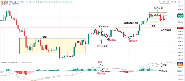 所以现在的比特币我们再来观察一下 这里会不会再来1到两根周线级别的空头K线 如果真的有大崩盘的话 我们到时候再来看看这个箱体支撑35000的区间 或者是最不理想的情况下 也是很多朋友在关心 到底比特币会不会又来到这个32000的支撑 所以我们暂时只能走一步看一步