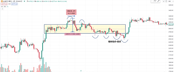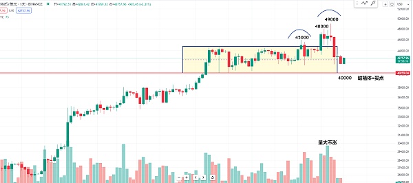 然后我们再来看一下比特币的日线级别的这个箱体 也就是这个箱体的区间 上面的高点 比如说45000 或者是48000到49000 他都是几次经过8天左右就回到了箱体 包括这次49000的时候我也是跟大家讲 这个位置下方量能非常的大 但是没有继续上涨 不涨的话 那现在猜对高点回来的话