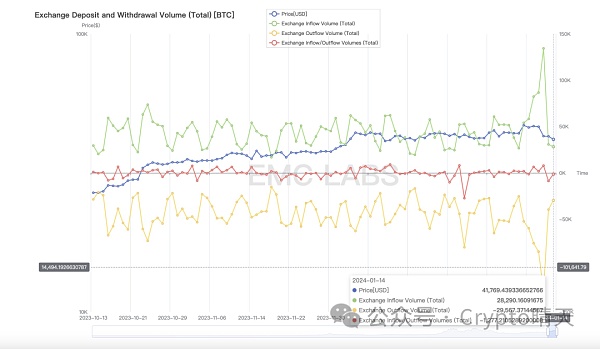 3、13-14日,BTC存入量快速下跌至5.8万枚,而提出量同步增加,CEX比特币净流出2万枚;所以10-14日,反而是净流出状态,可以视为买方顶住了抛压;